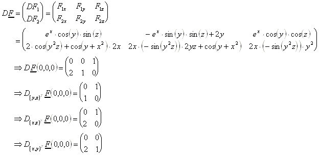 Aus den Beträgen der jeweiligen Determinanten wird sofort ersichtlich, daß nach y(x) und z(x) sowie nach x(y) und z(y) aufgelöst werden kann. Dagegen ist für die